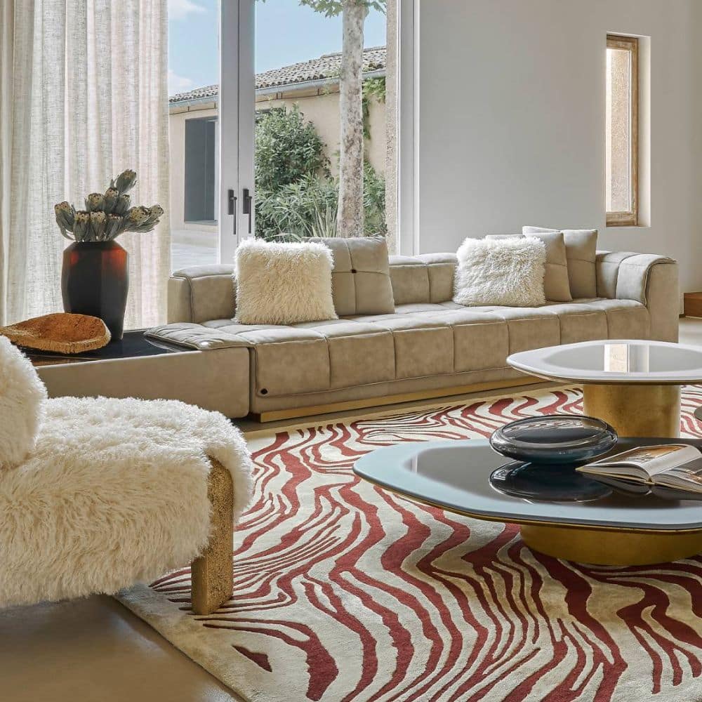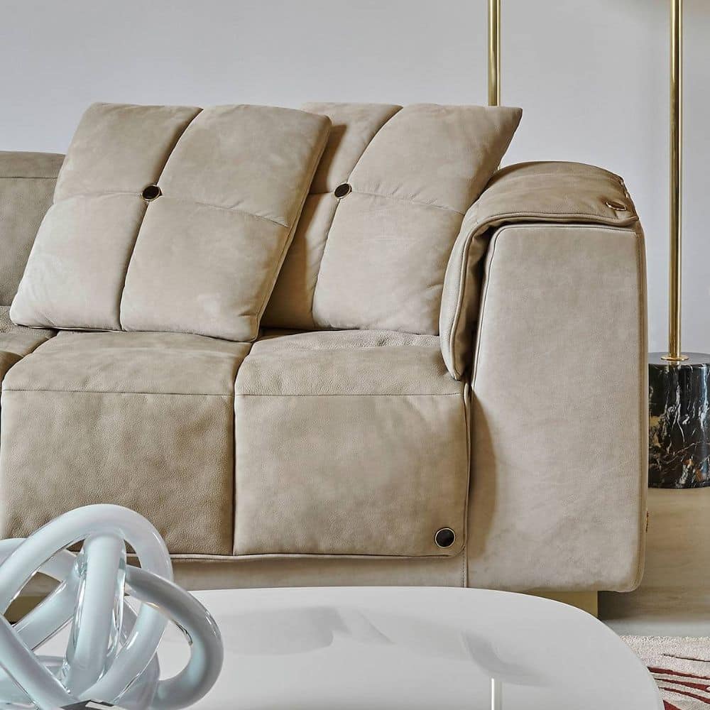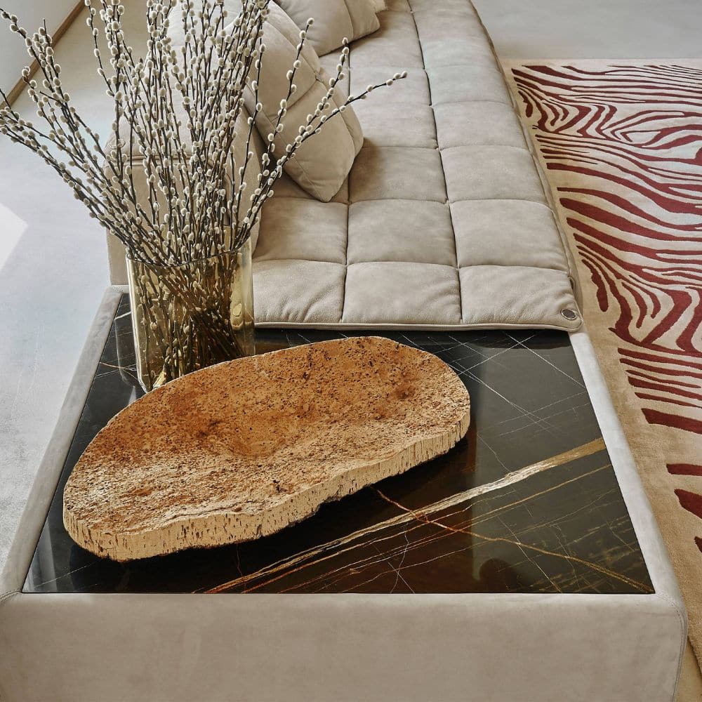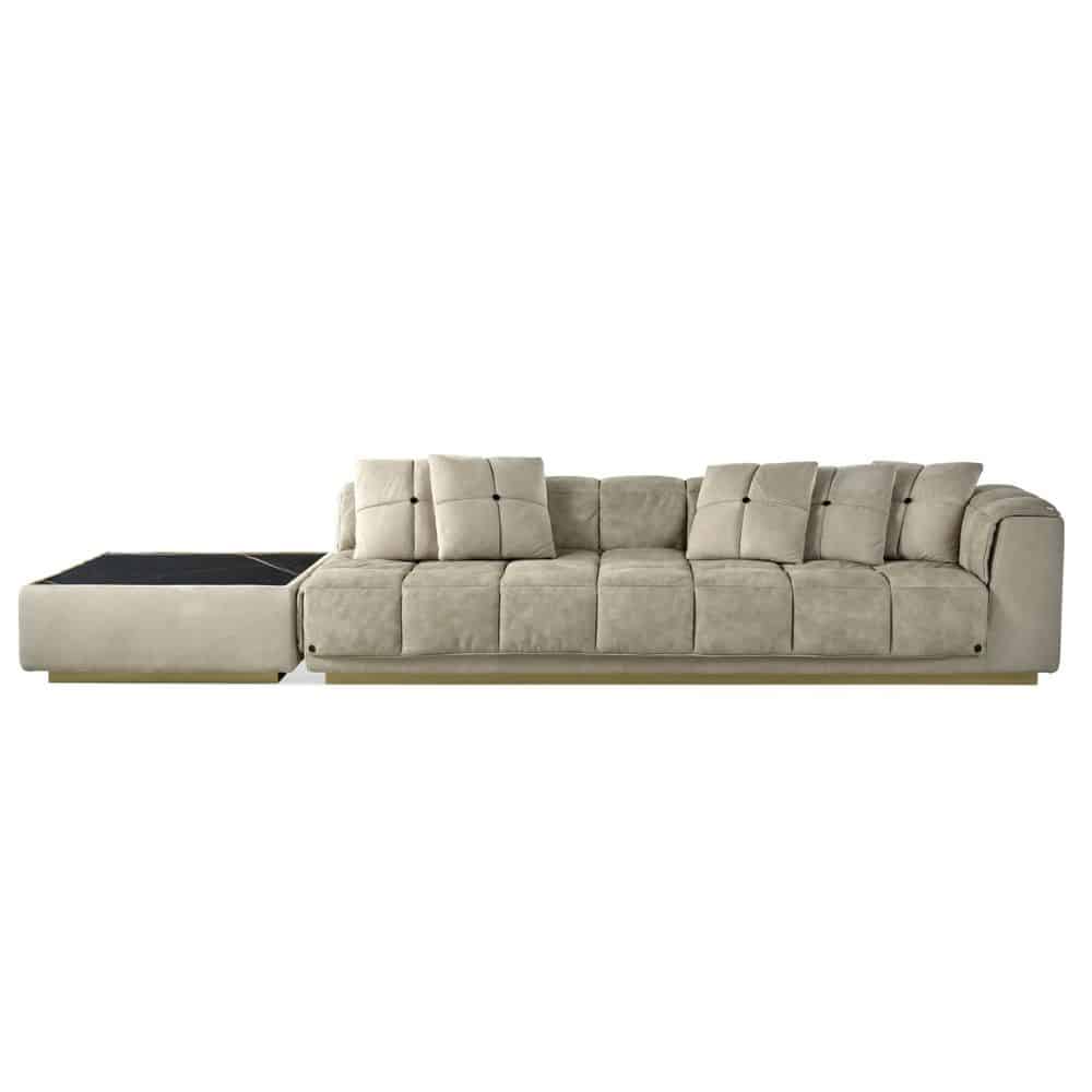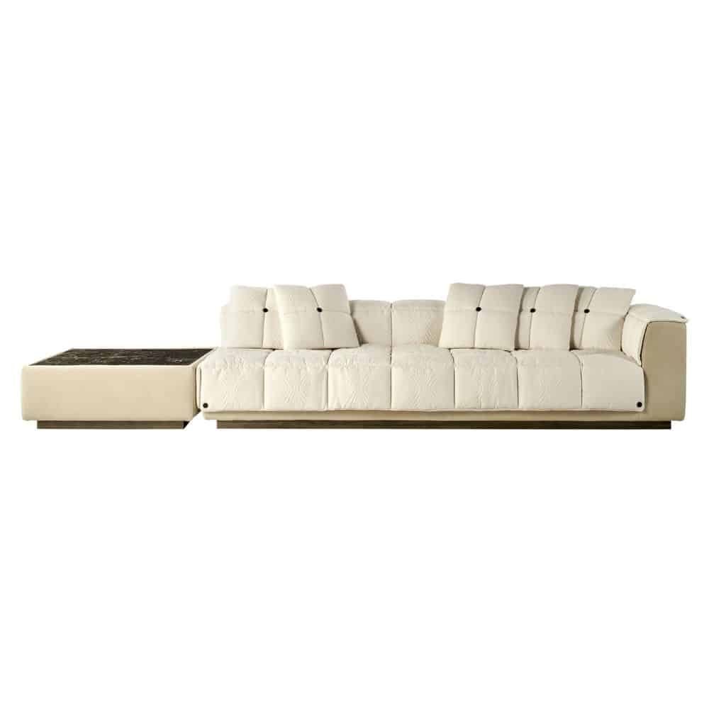 Amargosa is an innovative sectional sofa whose standout feature is the removable quilted padding, gently resting on the base with a magnetic attachment system. This clever solution allows for effortless customization, offering a quick and stylish way to refresh the look of your sofa. The quilting adds a touch of sophistication, while the base in brushed bronze finishing enhances the design with a sense of warmth and luxury. For added functionality and aesthetic balance, the composition can be completed with a side table.