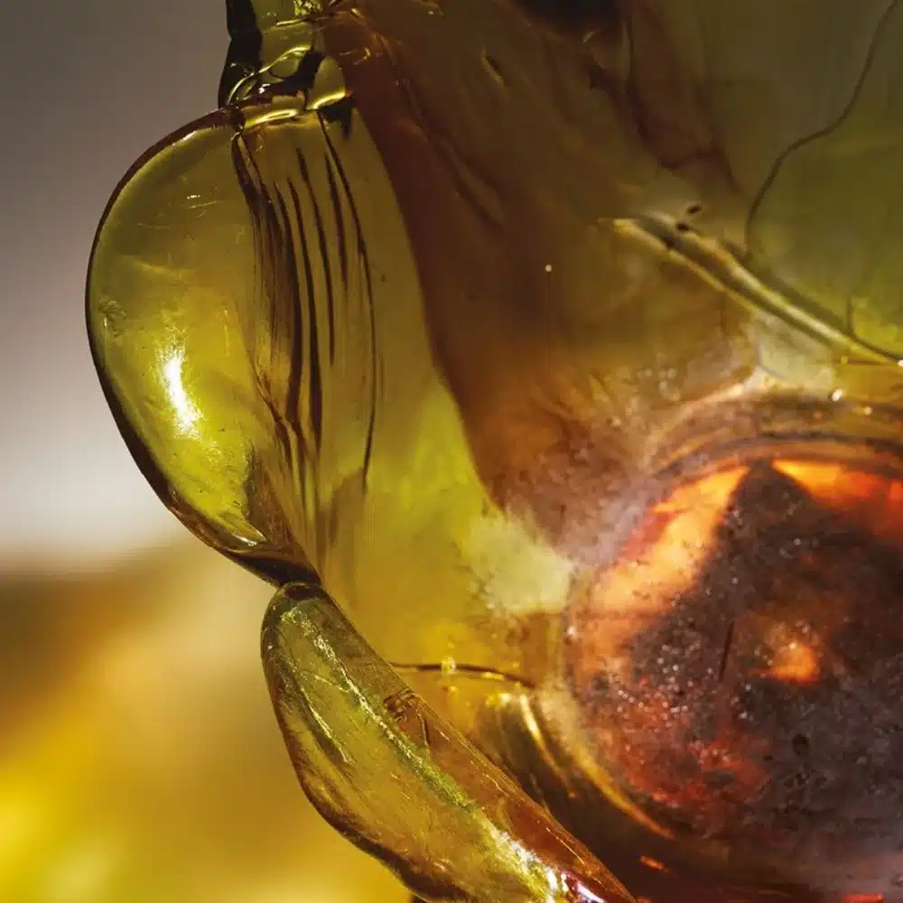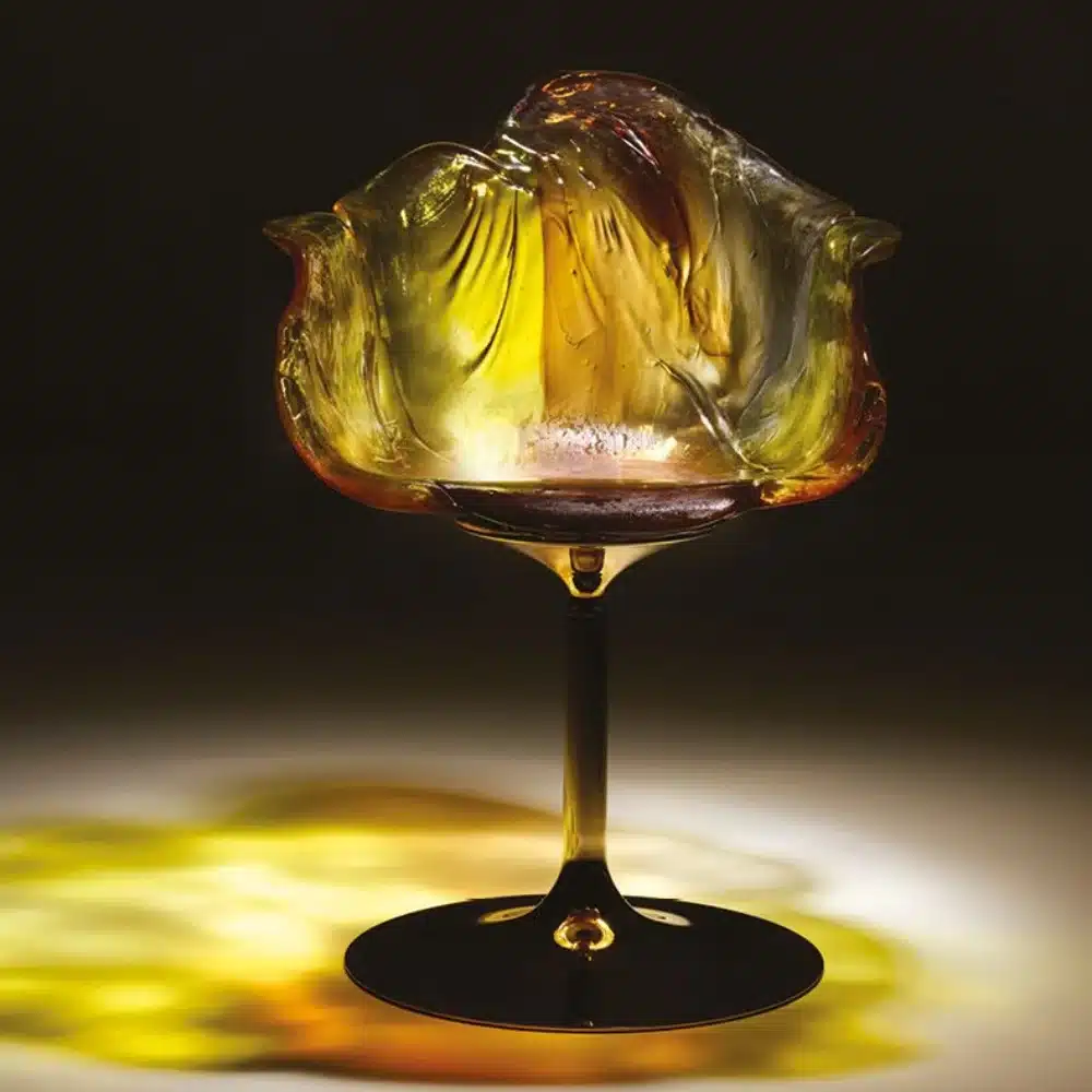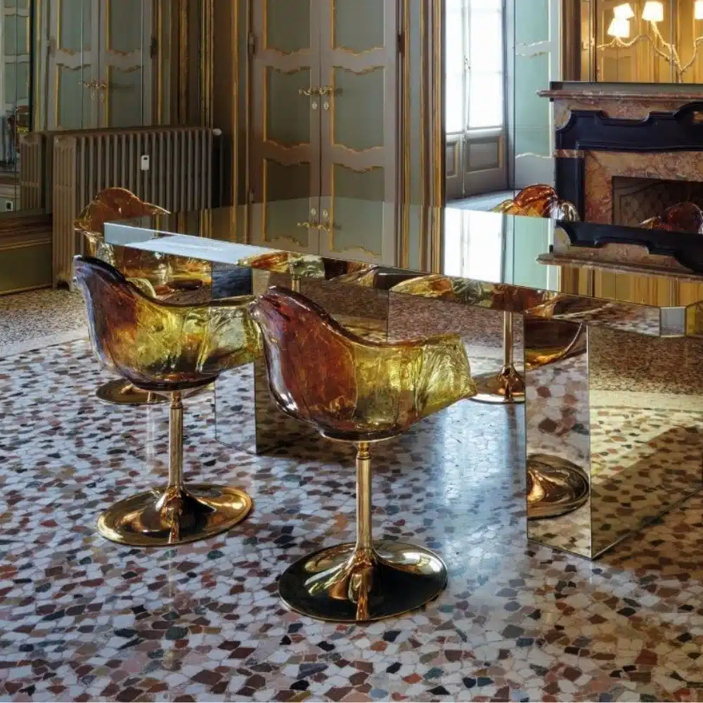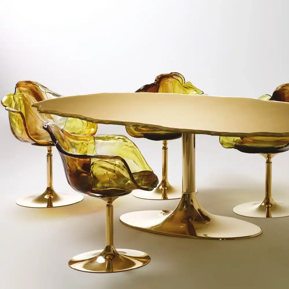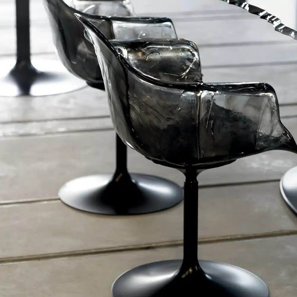 Chair with armrests, entirely handmade in polycarbonate. It is supported by a pedestal that allows rotation which stem is black and the petals of transparent and soft hues mix green and blue or gold or anthracite, recalls the shape of a flower. The elegant, comfortable seat perfectly fits in with any setting. Each piece is unique, as it is shaped by hand.