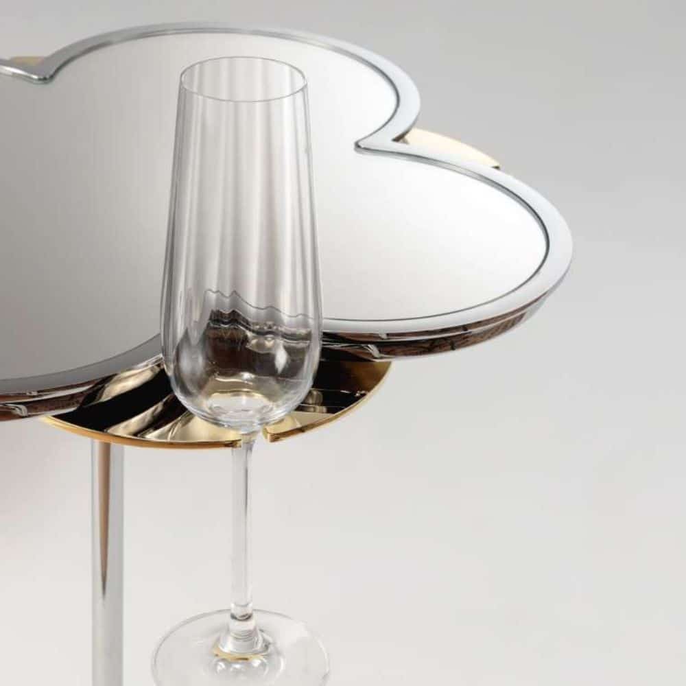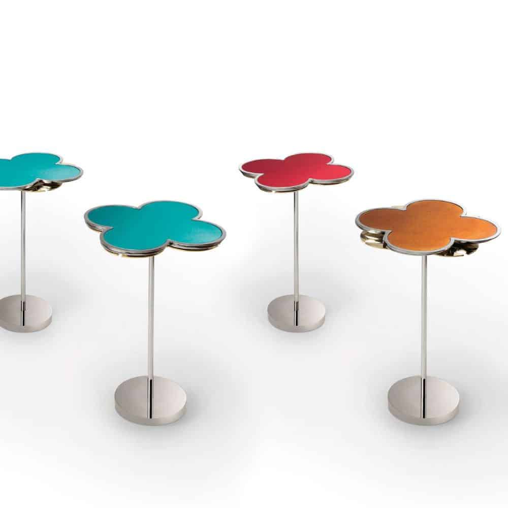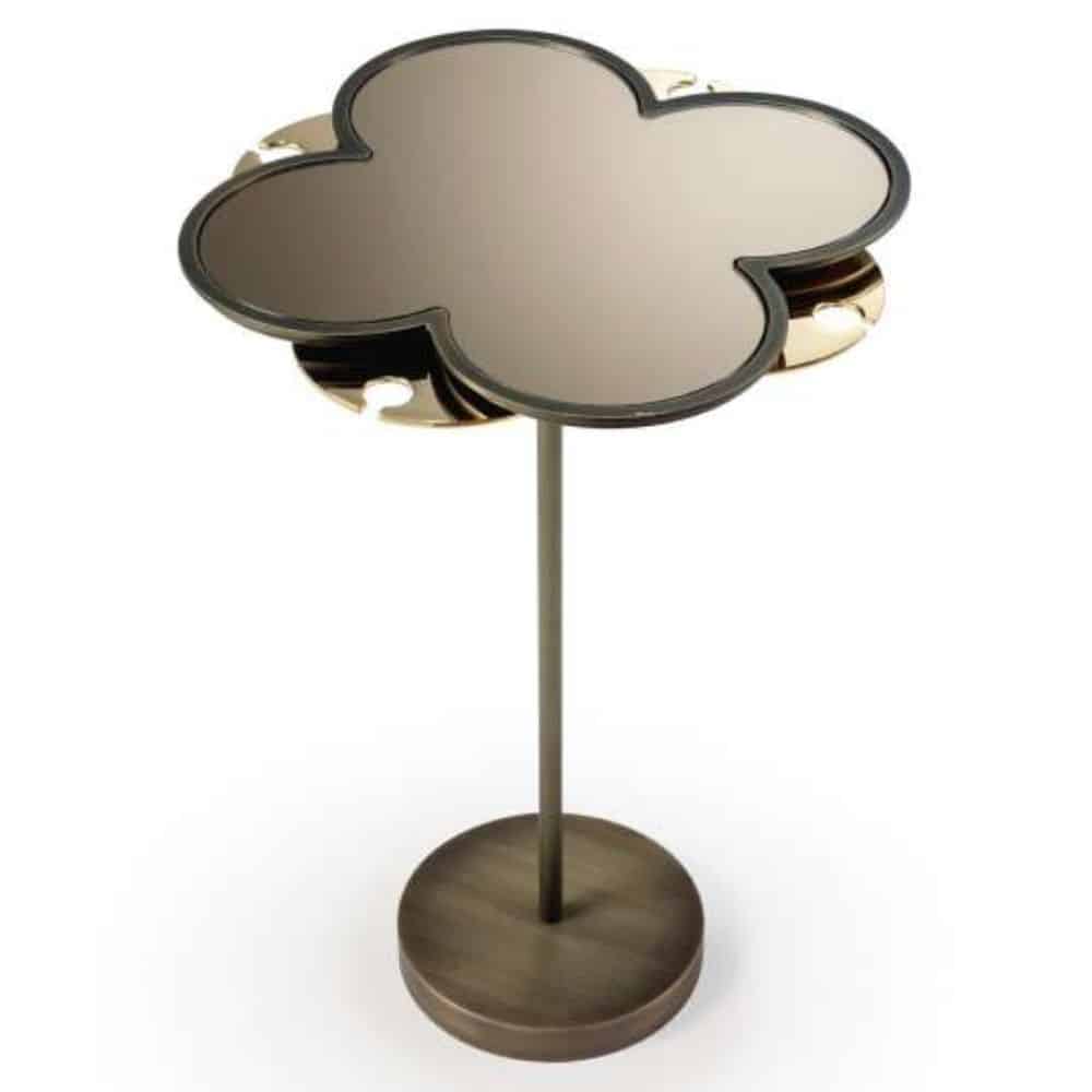End tables with chromed metal structure or dark satin brass finish. Top in blue, amber, emerald or mirror enamel effect glass and bronze mirror. Swivel glass holder mechanism in gold finish.