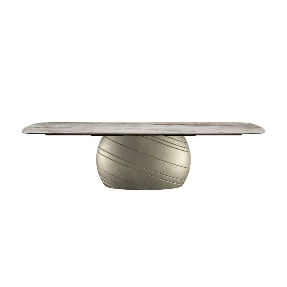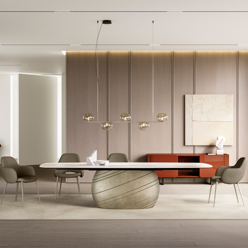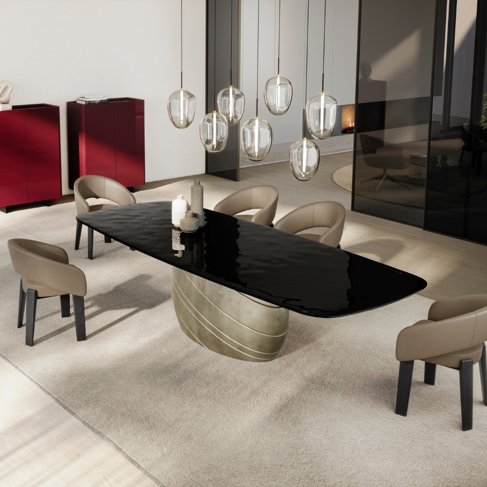 The Giove Table with ceramic top (also available in glass, wood, or marble) is a designer table created to enhance sophisticated interiors with bold, minimalist elegance. A sculptural furnishing piece where refined aesthetics meet the durability of contemporary materials. Designed by Andrea Lucatello, the table is named after the planet Jupiter — symbol of prosperity, grandeur, and cosmic harmony. Its clean, well-defined top evokes the orbiting profiles of the gas giant, turning every detail into a visual suggestion. The sculptural base, made of painted cement coated with resin, conveys solid and dynamic presence. The ceramic top, available in rectangular or shaped versions, guarantees excellent performance: heat, stain, and scratch resistant—without compromising elegance. The exclusive version with a rounded lacquered edge fully embraces the top, enhancing its volume and creating visual continuity that emphasizes material quality.