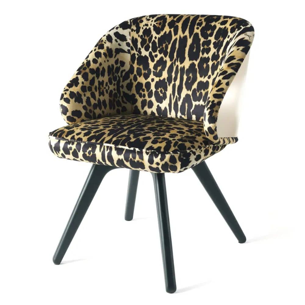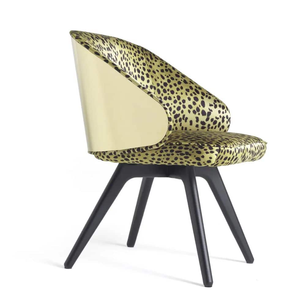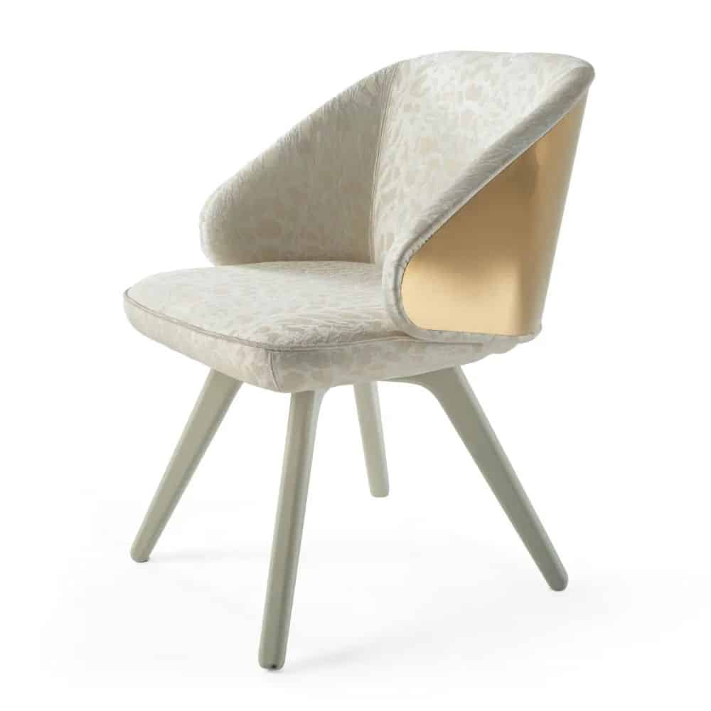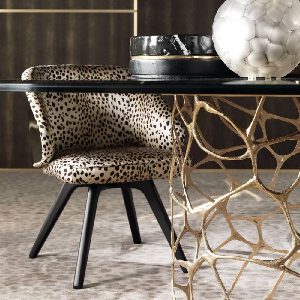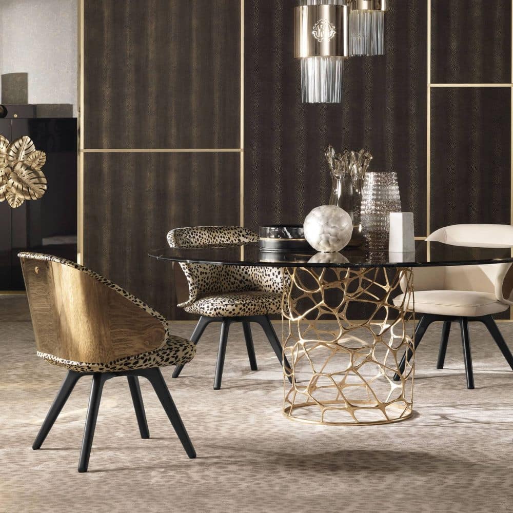 Appealing design and vintage lines for the Key West chair. Featuring sinuous and rounded shapes, it boasts an enveloping back with gold finishing and a comfortable seat upholstered with the silks, fabrics or leather of the collection. Sensuality, warmth and charm: the perfect ingredients to create a relaxing setting in your home.