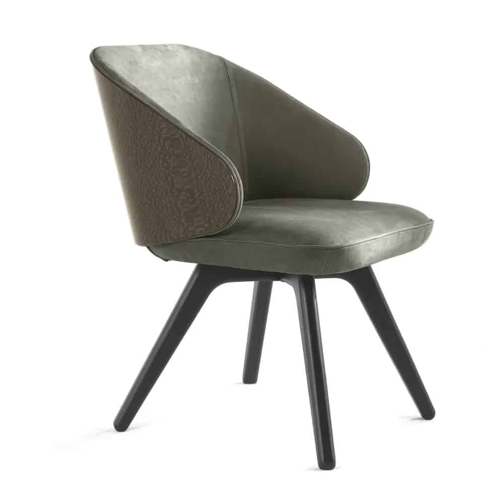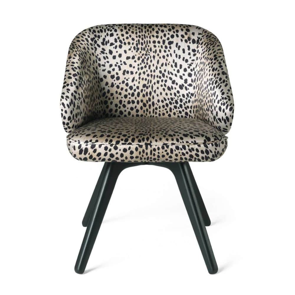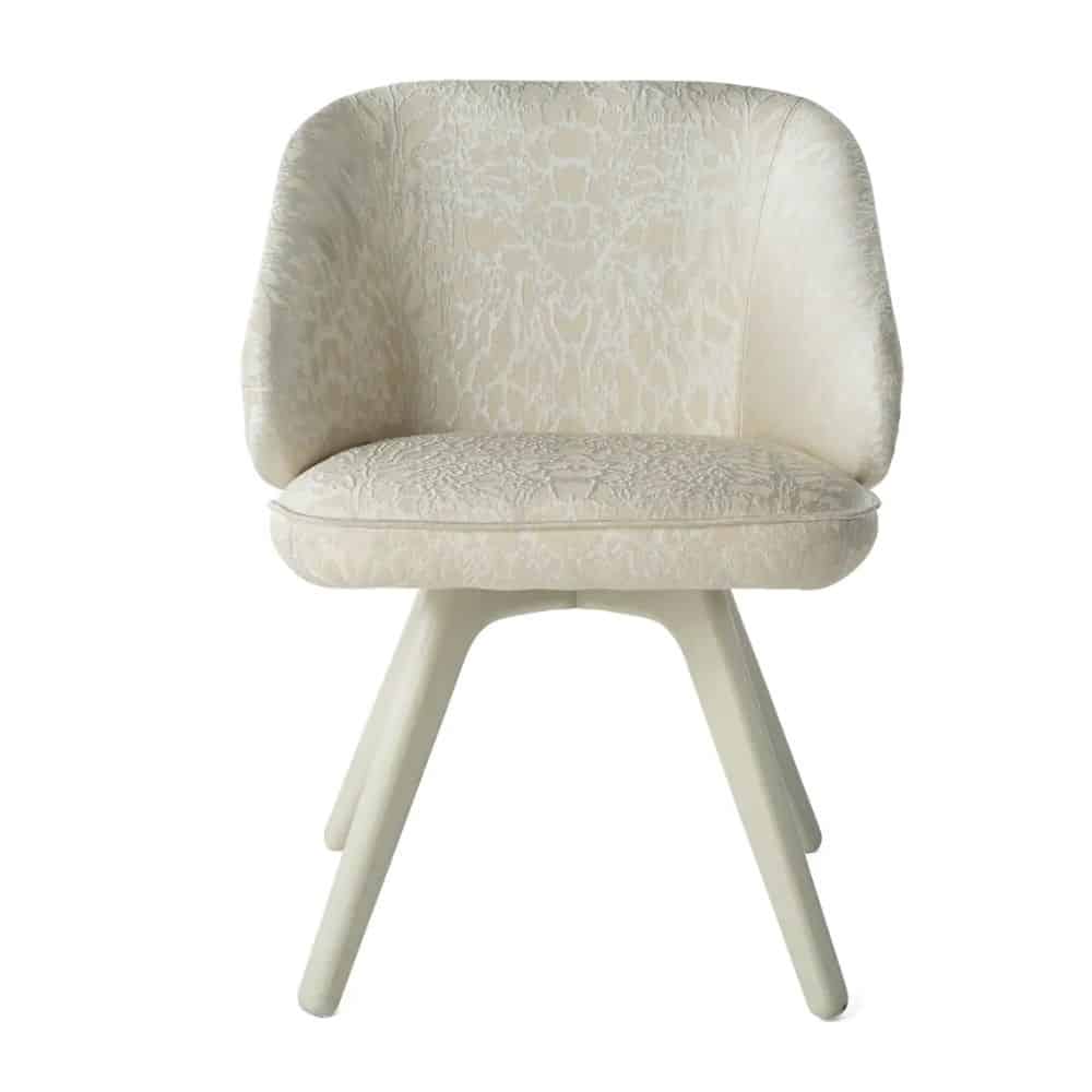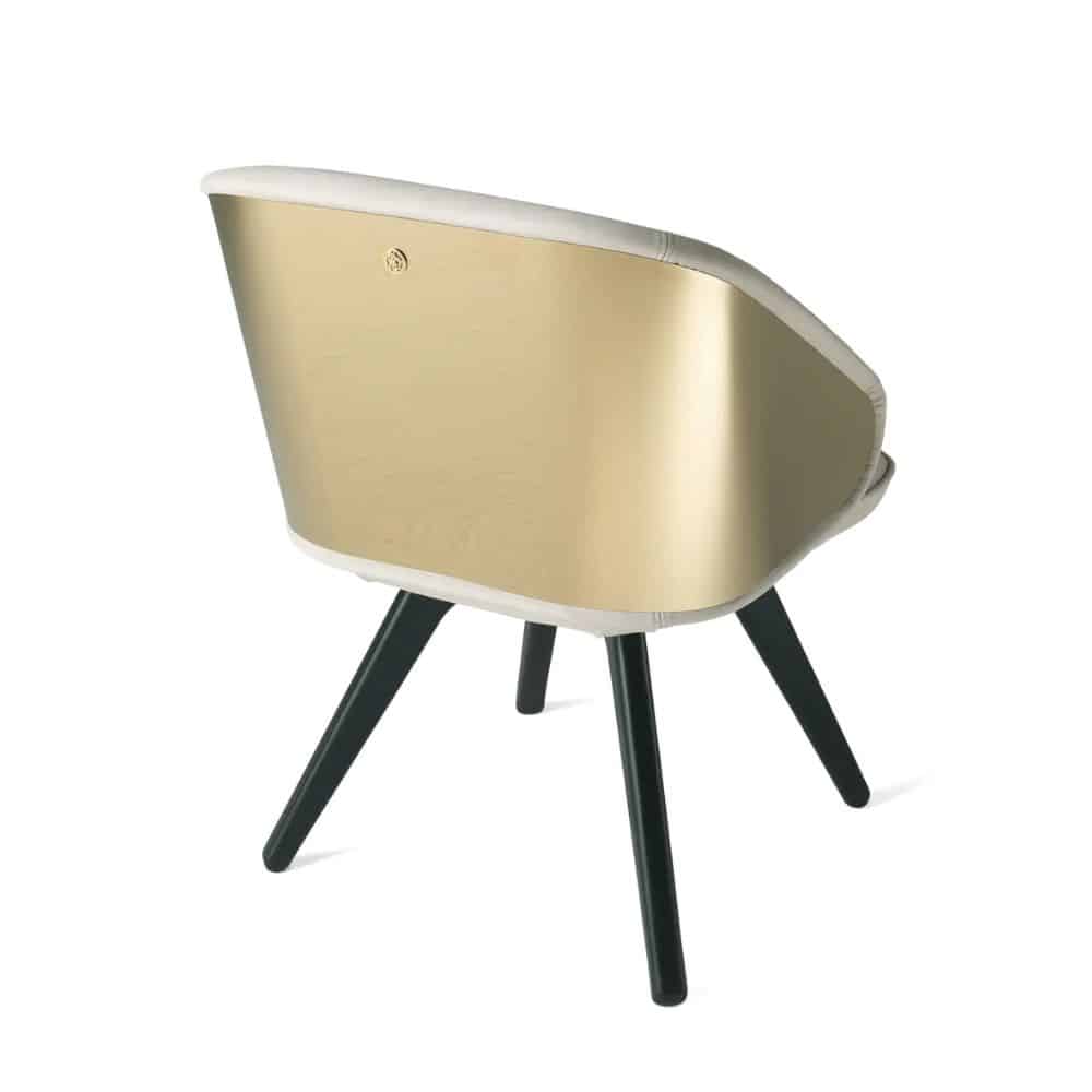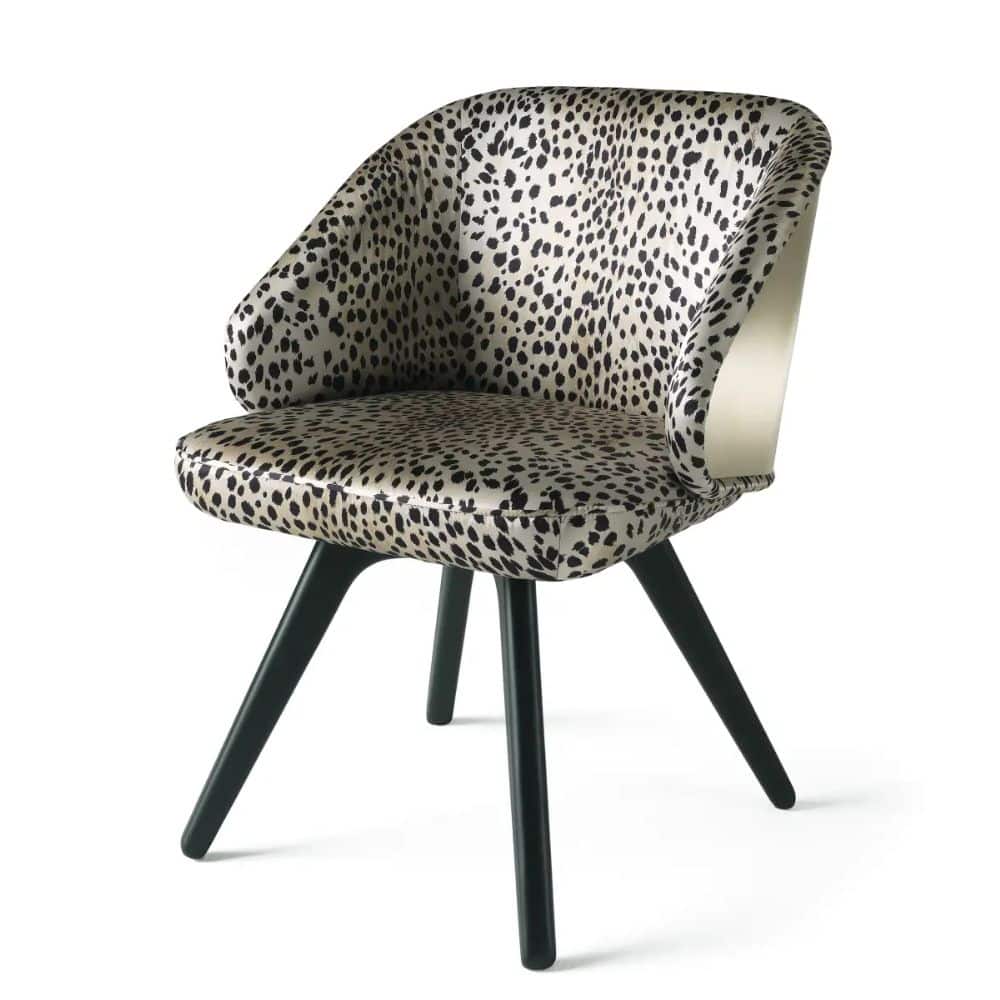 Appealing design and vintage lines for the Key West chair. Featuring sinuous and rounded shapes, it boasts an enveloping back with gold finishing and a comfortable seat upholstered with the silks, fabrics or leather of the collection. Sensuality, warmth and charm: the perfect ingredients to create a relaxing setting in your home.