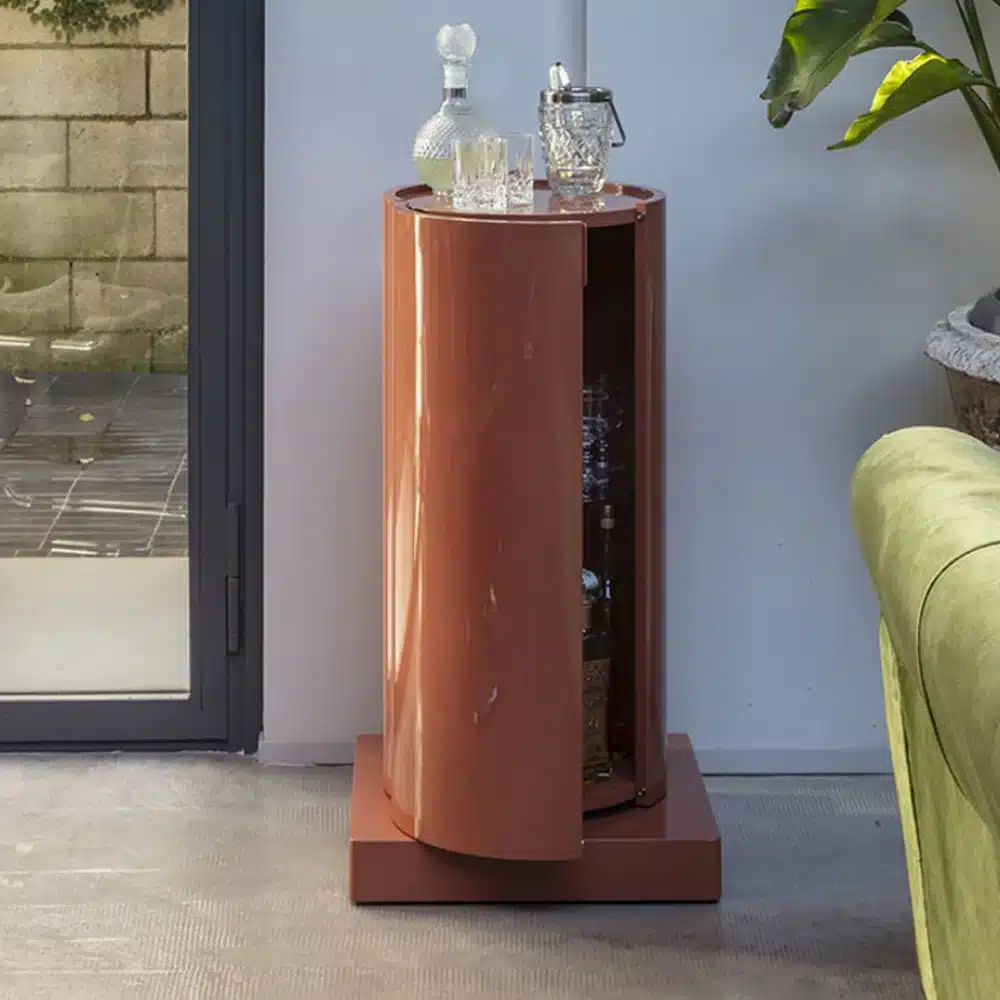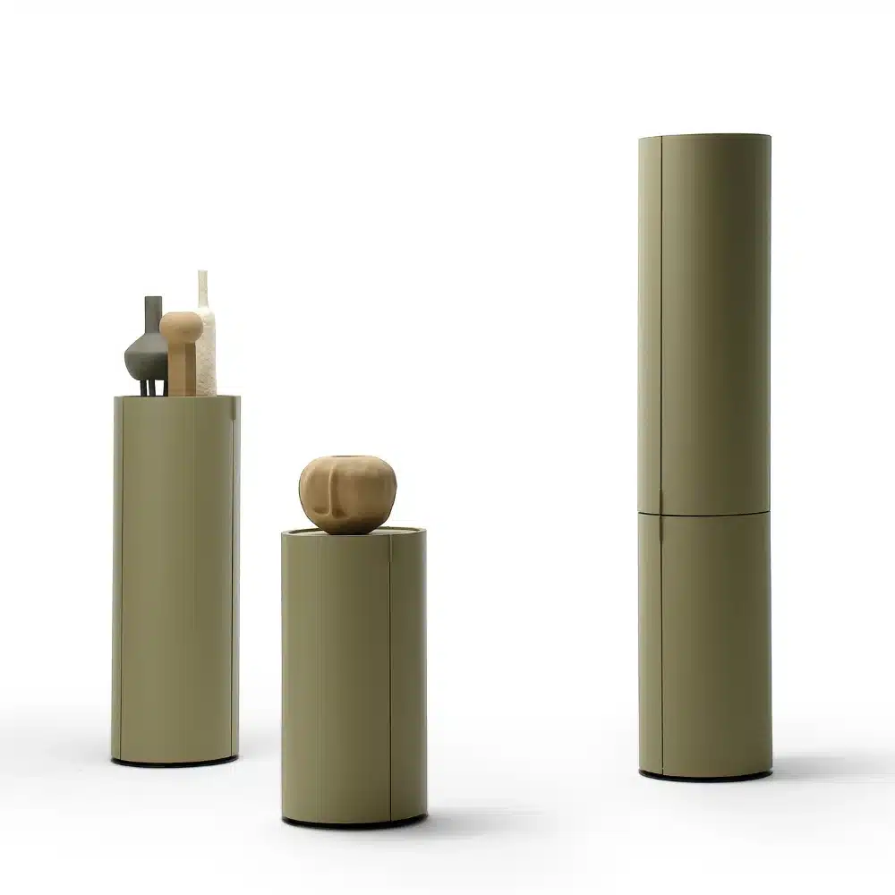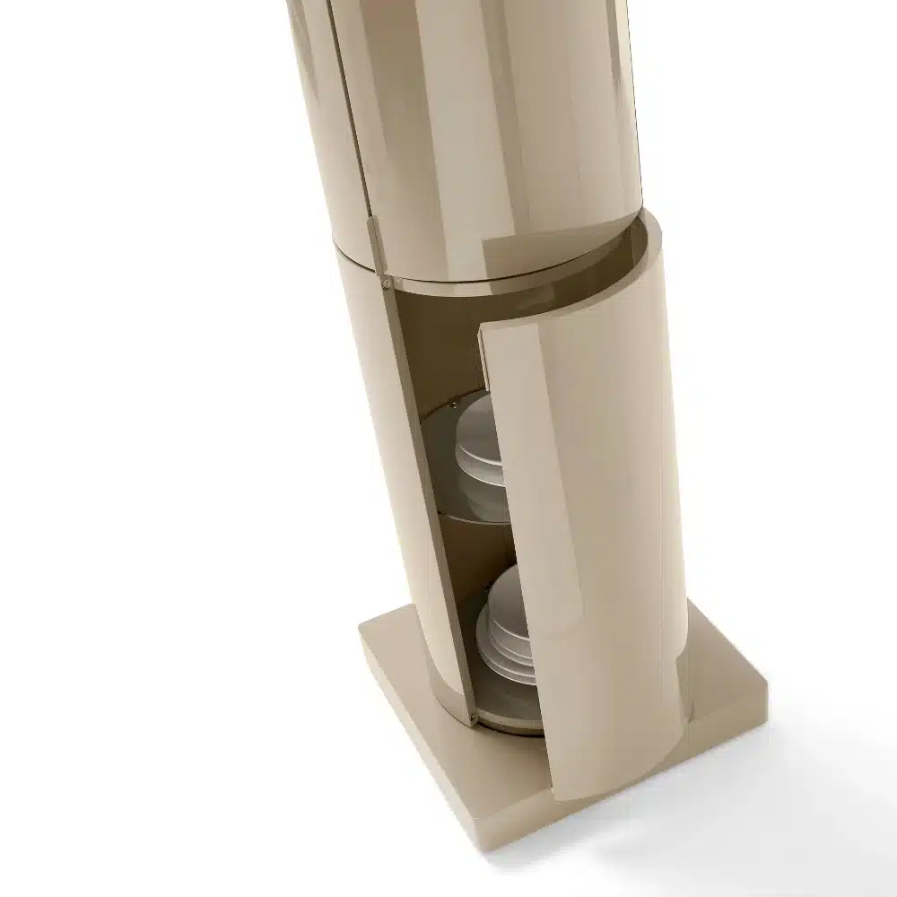 LA DORI is a minimal, essential, circular container, free from supports, so that it can be revealed by turning around it. The structure is made in curved plywood, matt or glossy lacquered in all colors as per the samples and base available in honeycomb lacquered like the column or in black metal.