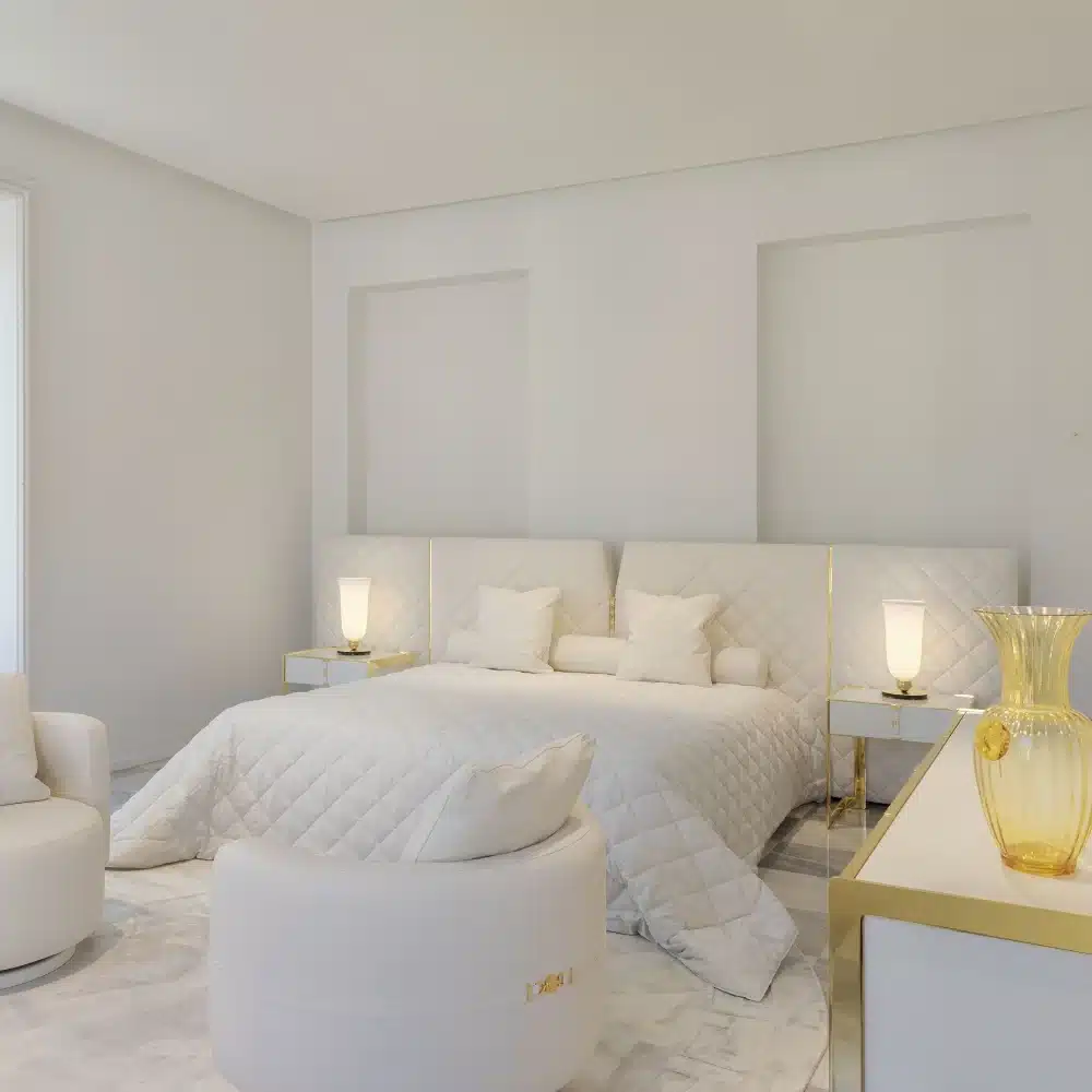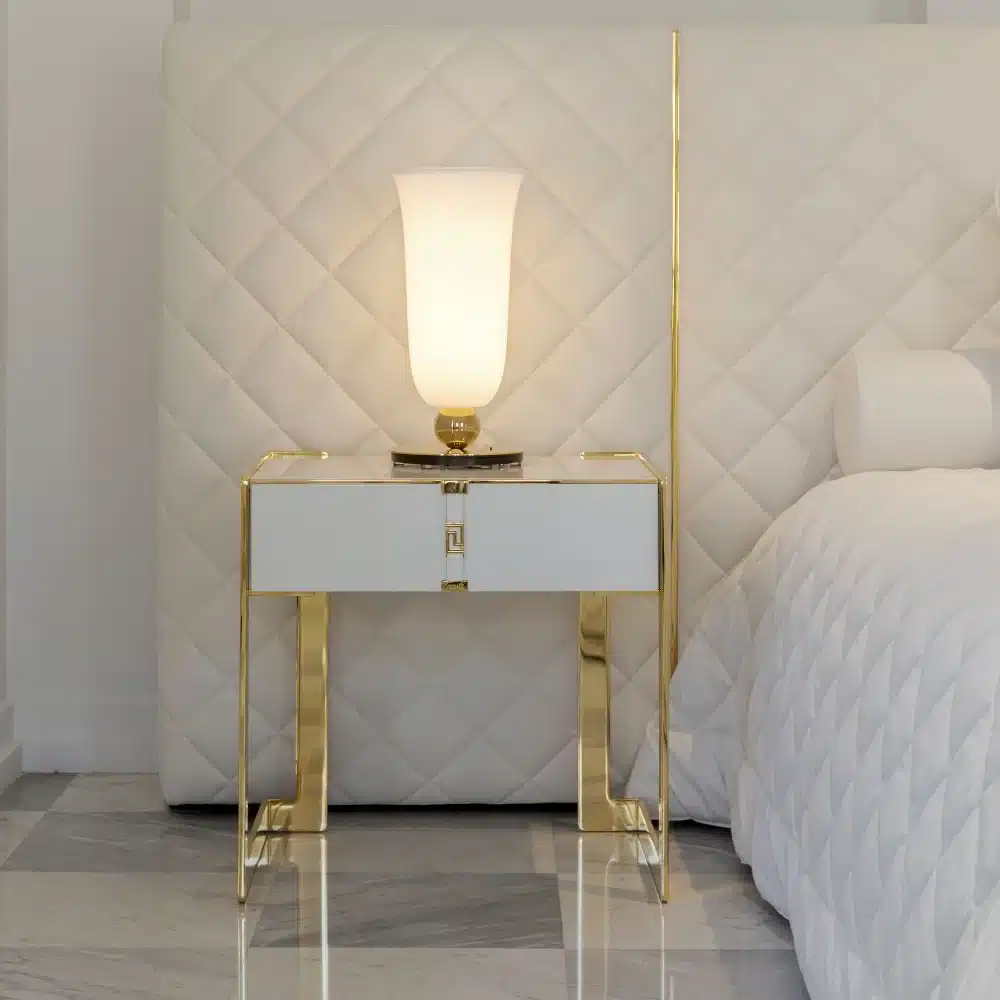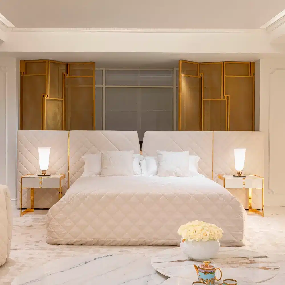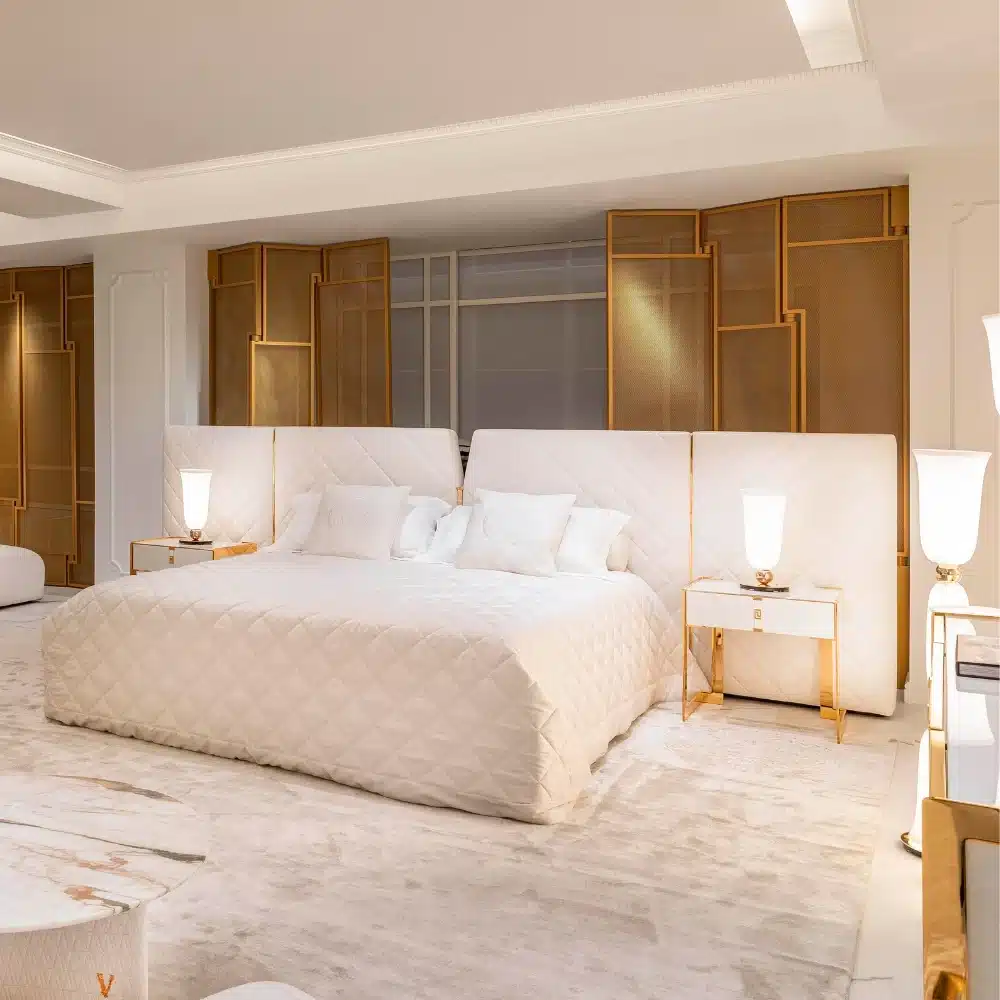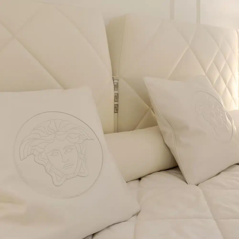The essence of Versace Home design is expressed through the upholstered headboard accentuated by a central leather band, embellished with a metal logo in polished gold or polished chrome. The upholstered frame, composed of side panels, with the base showcase refined aesthetics and exceptional technical details. It can be upholstered in non-removable fabric or leather for maximum customisation.