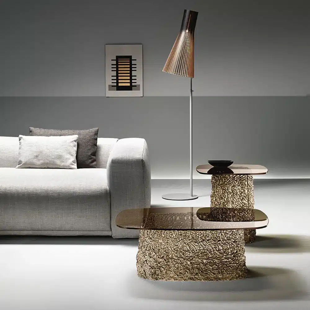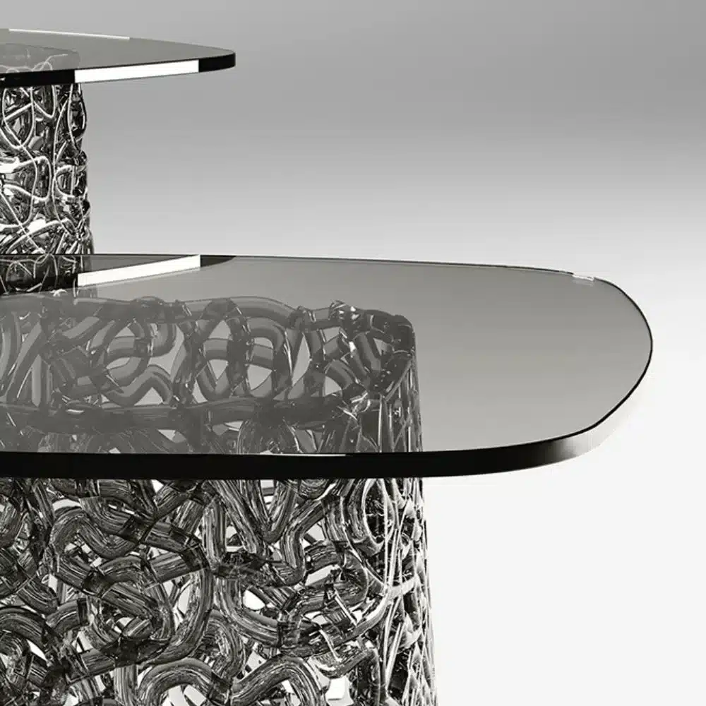 Collection of coffee tables comprising hand-interwoven spun glass base and 10 mm-thick glass top. The coffee table collection includes the following finishes: extralight glass top with extralight glass base; bronze glass top with bronze painted base; fumè grey glass top with fumè grey painted base.