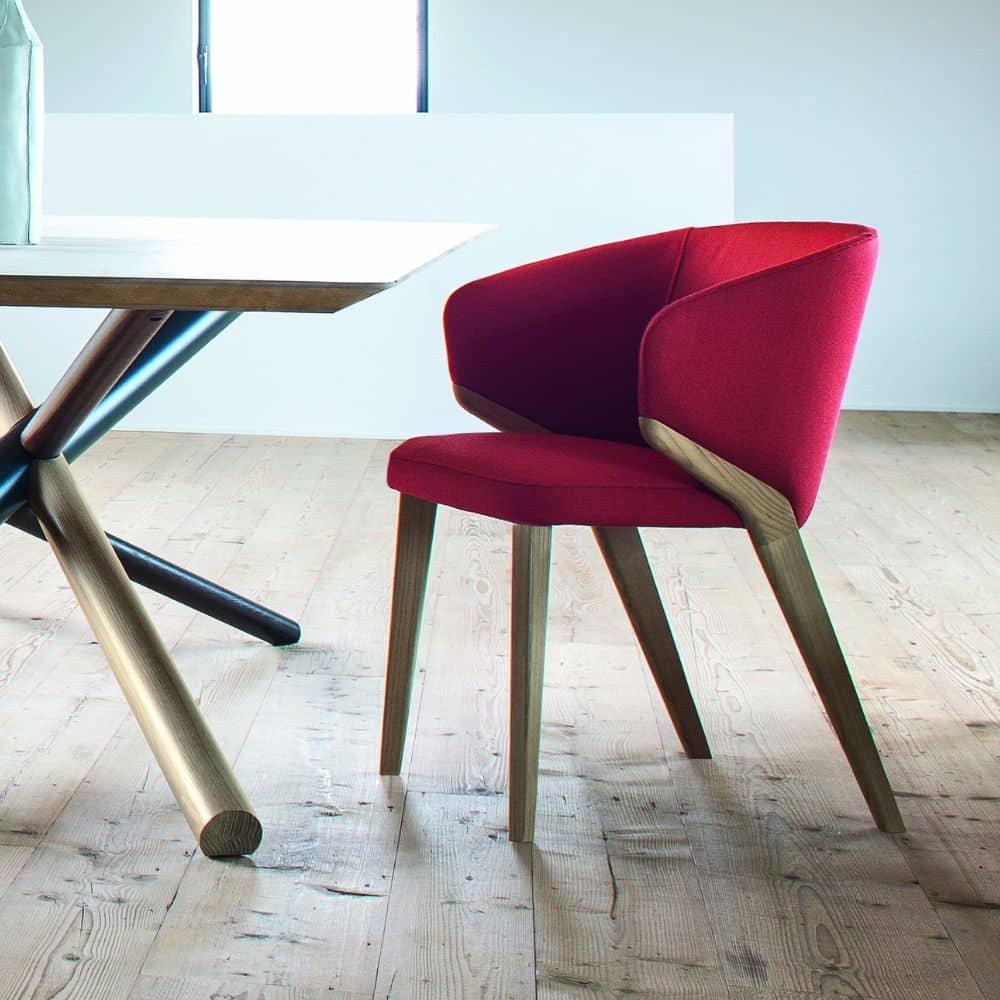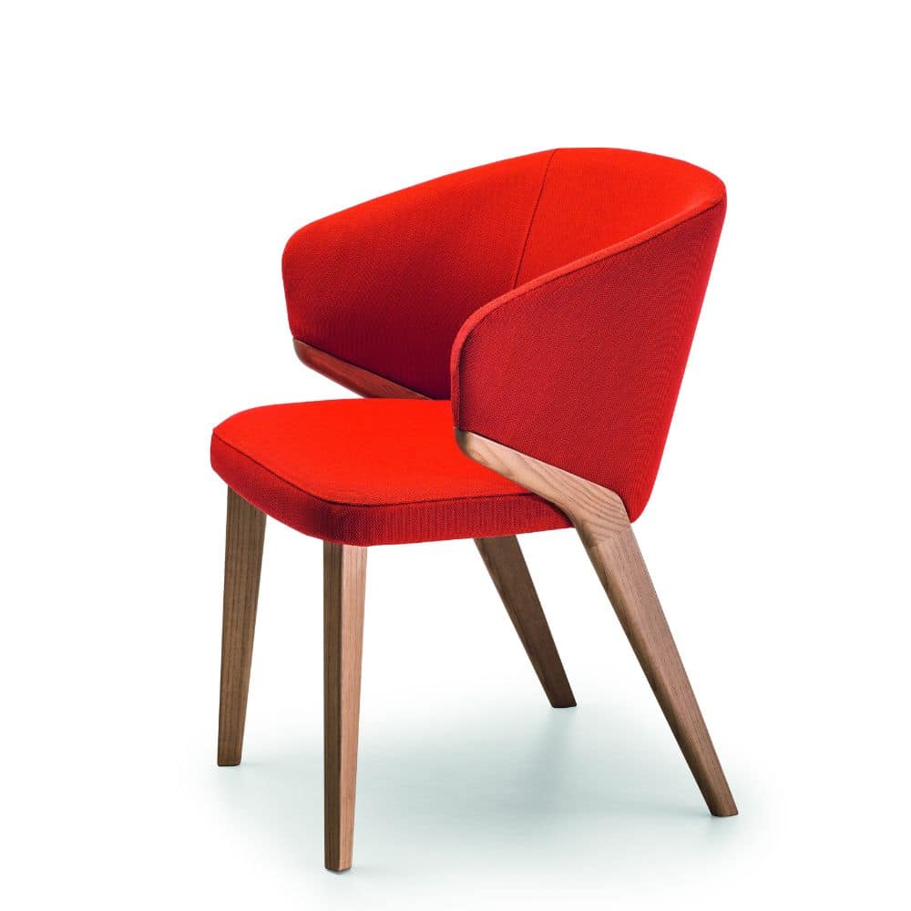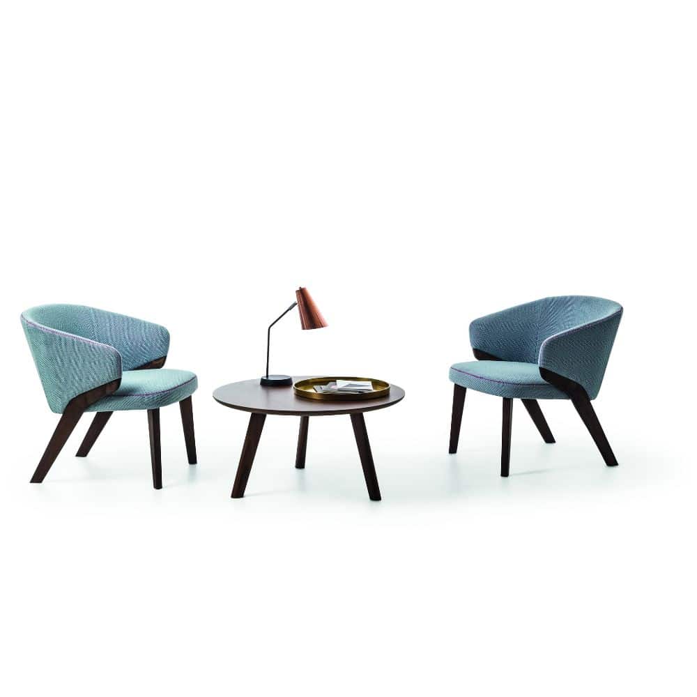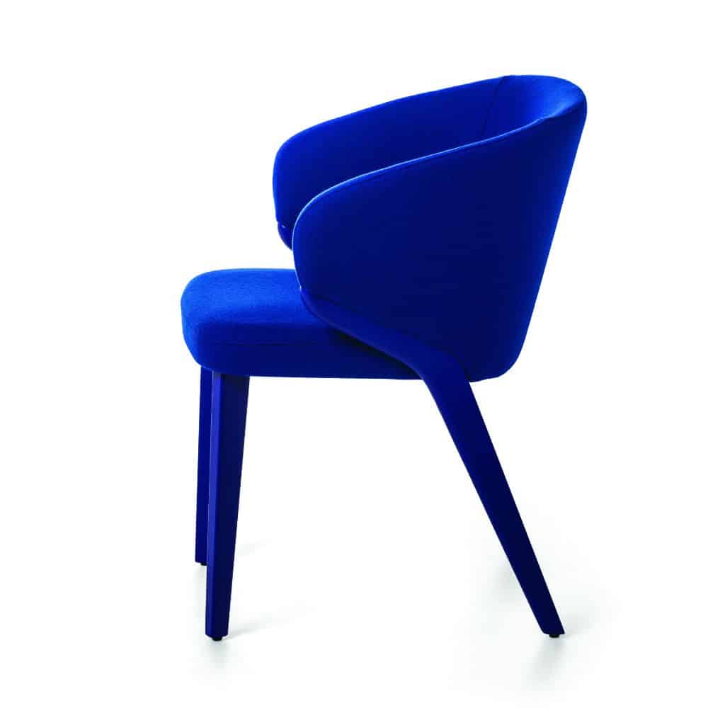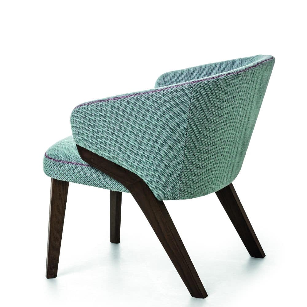 The collection designed by Michael Schmidt is composed of an armchair, a lounge armchair and a stool in which the solid wood structure becomes the identifying mark of its design. The rear legs, in natural ash, stained or matt lacquered, extend to define the lower profile of the armrest, with a double decorative and functional value. The shell, padded and covered in leather or fabric, is embellished with tone-on-tone or contrast stitching.