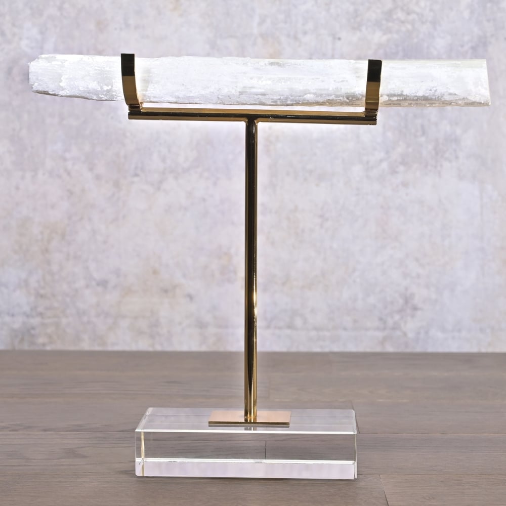 A natural selenite sculpture elevated on a minimal stand, highlighting crystalline structure & material contrast.