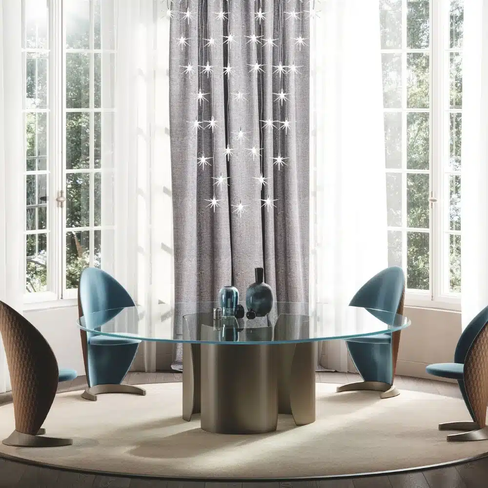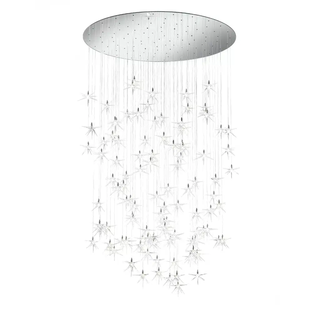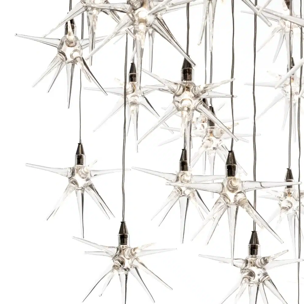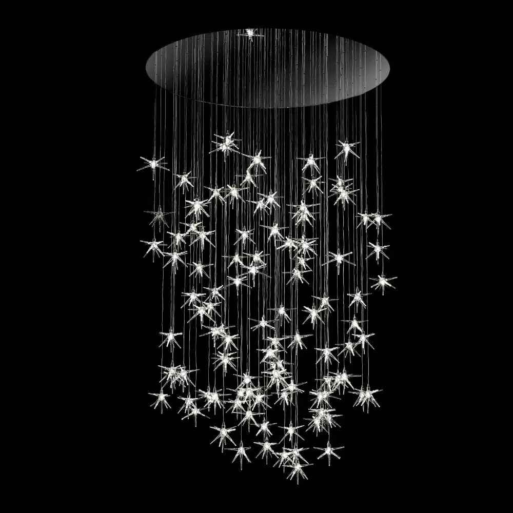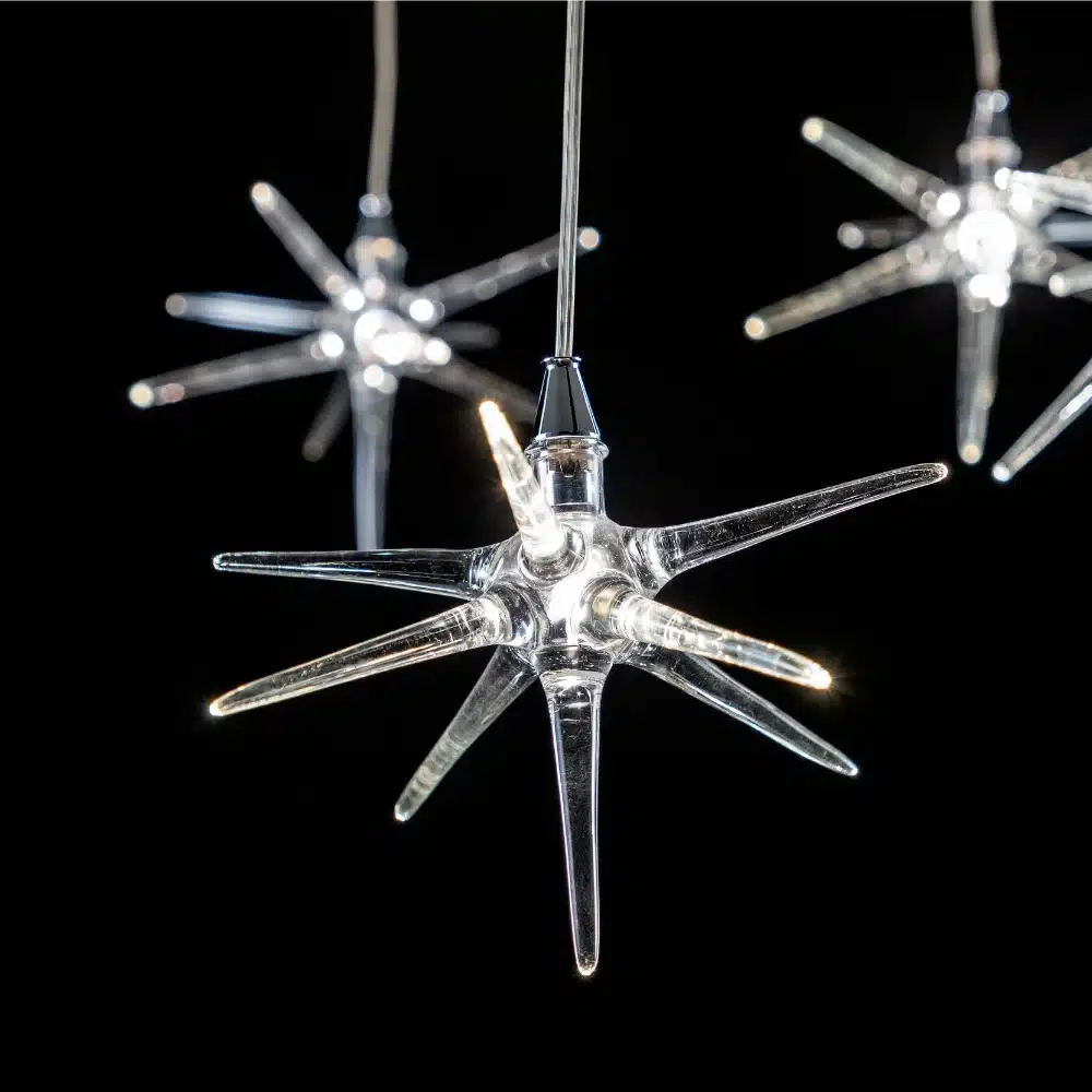 Chandelier with support in white or black lacquered or mirror glass and pendant stars in blown borosilicate glass, transparent or coloured with LED. It is possible to realize customized versions for dimensions, length and shape.