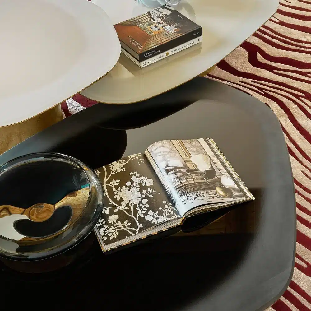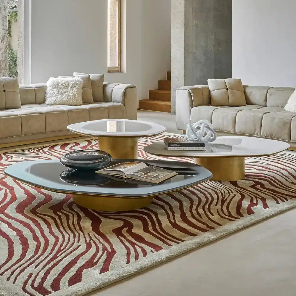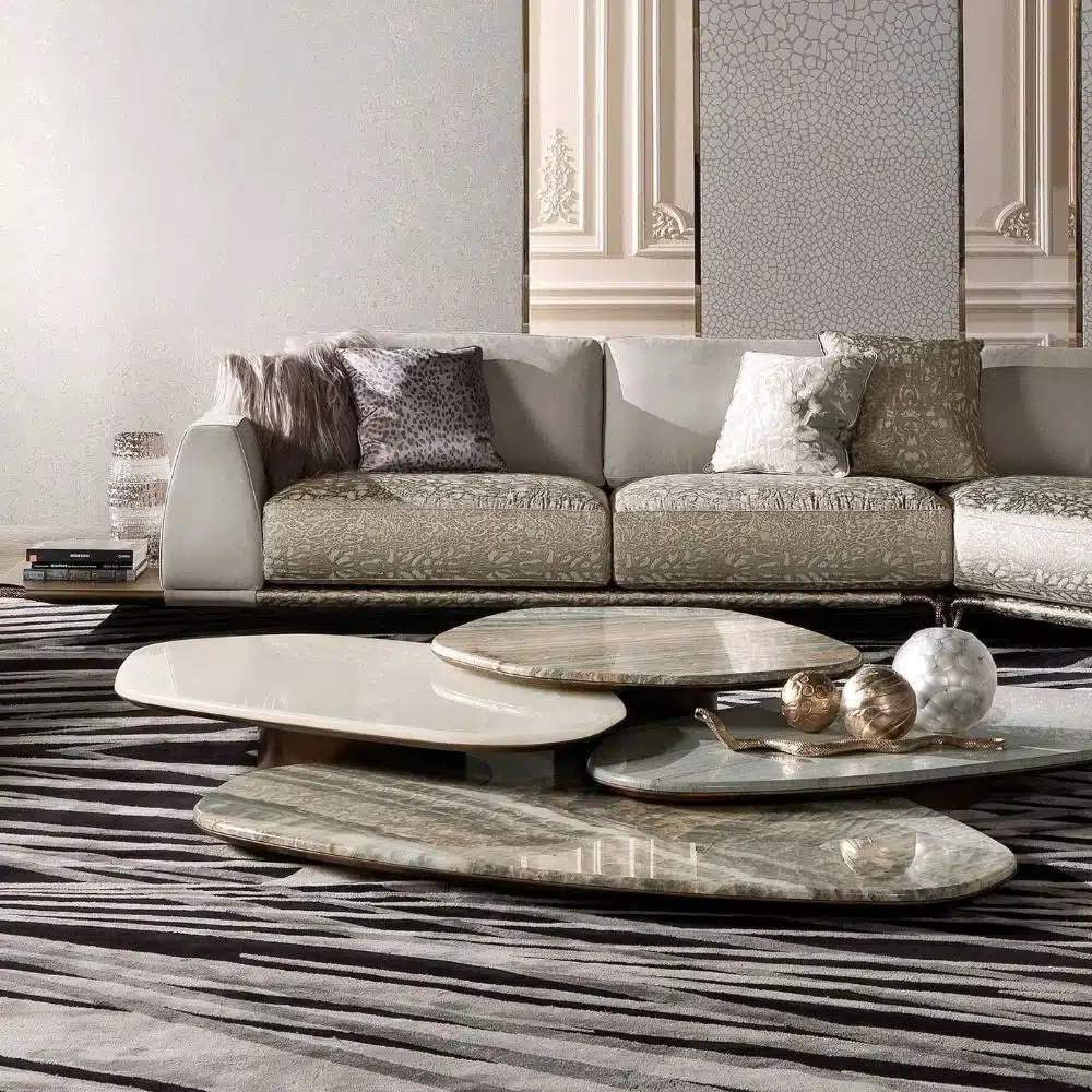 A striking coffee table with a strong scenographic impact. The asymmetric tops in different varieties and shades recall the irregular beauty of nature.